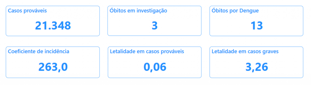 Já no estado do Pará que possui 8.120.131 habitantes, teve 21.348 casos prováveis, sendo que 3 óbitos estão em investigação e 13 óbitos por dengue foram confirmados.