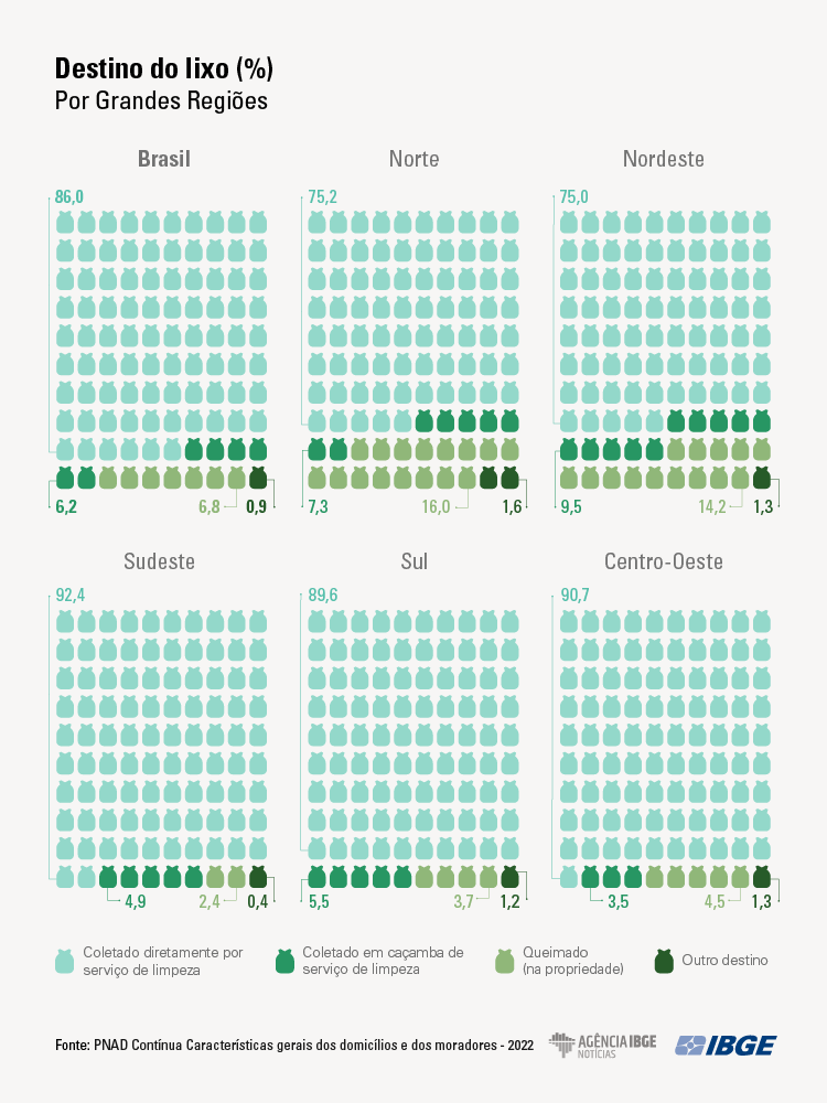 Considerando-se apenas os domicílios urbanos, em 93,8% dos domicílios o lixo era coletado por serviços de limpeza. O Nordeste era a única grande região onde este serviço atendia a menos de 90% dos domicílios urbanos em 2022, chegando a 88,4% dos domicílios.