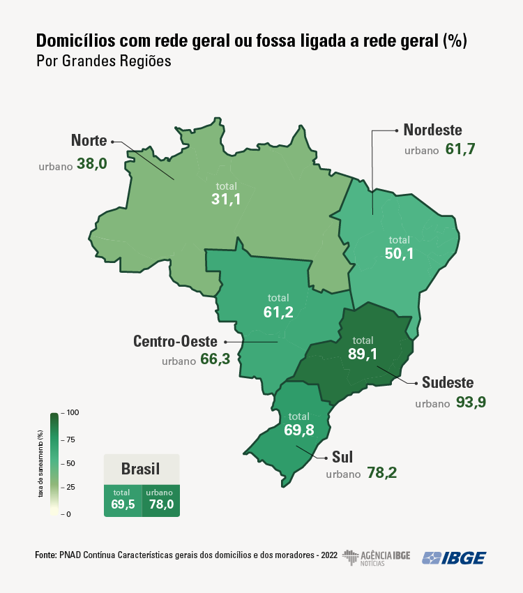 Em 2022, entre os domicílios urbanos, 78,0% tinham esgotamento sanitário por rede geral coletora. Os maiores percentuais de domicílios urbanos com este serviço estavam no Sudeste (93,9%) e no Sul (78,2%), com Centro-Oeste (66,3%), Nordeste (61,7%) e Norte (38,0%) a seguir.
