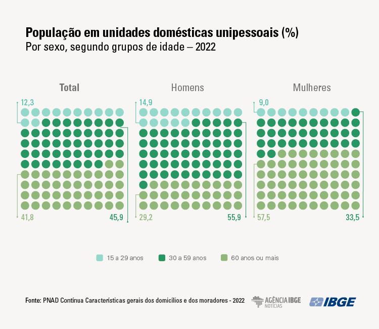 “Além do aumento dos domicílios unipessoais, há um detalhe importante: enquanto 55,9% dos homens que moravam sozinhos em 2022 tinham entre 30 e 59 anos, a maior parte (57,5%) das mulheres morando sozinhas tinha 60 anos ou mais”, destaca Gustavo.