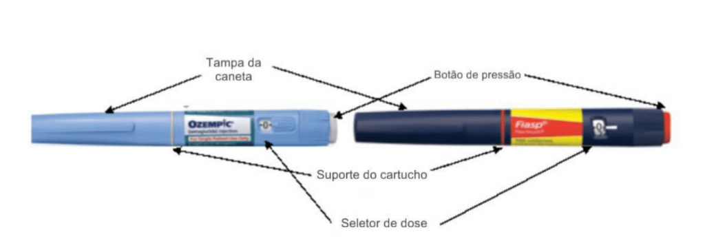 • Cor e design da caneta: a caneta de Ozempic® tem cor azul clara e botão de aplicação cinza. Já a caneta de insulina Fiasp® FlexTouch® é azul escura, com botão laranja;