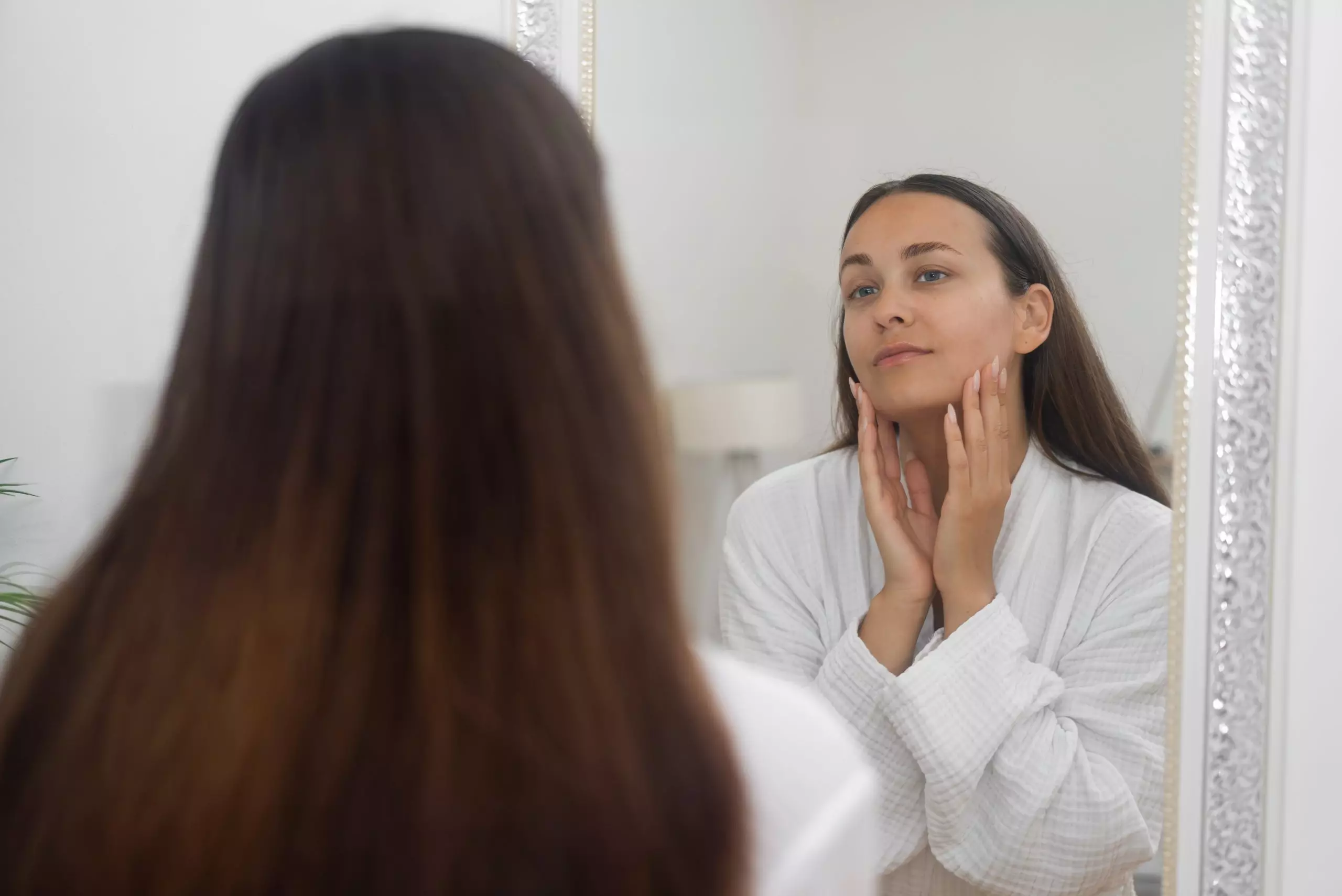 Uma mulher, de roupão de banho, pratica a rotina de beleza de cuidados com a pele em casa, estudando-se no espelho do banheiro Por demopicture