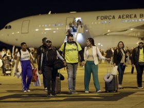 Um grupo de cidadãos brasileiros que recentemente retornou ao Brasil como parte da “Operação Voltando em Paz” em ...