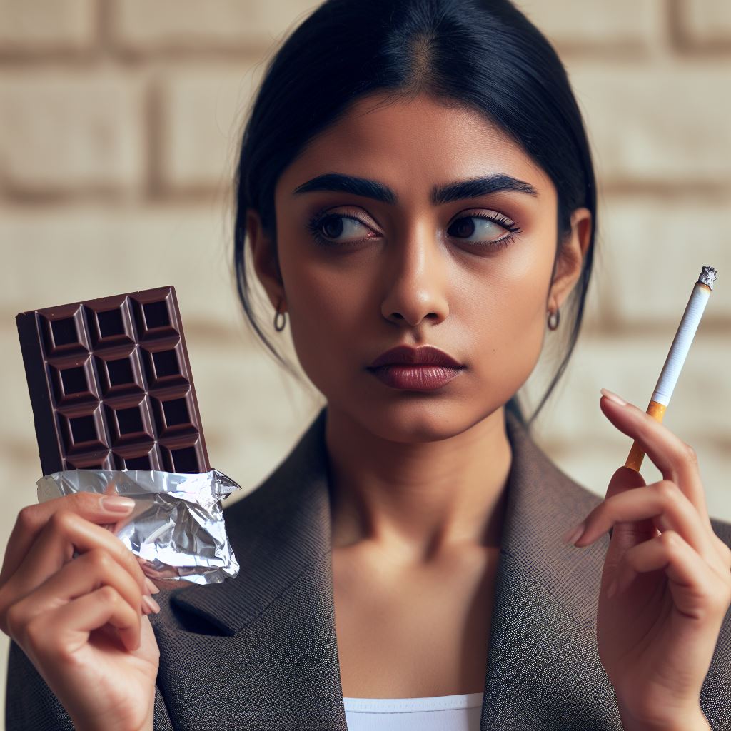 O receio de ganhar peso ao parar de fumar é comum, e a pesquisa destaca que o chocolate amargo, consumido em uma porção diária de 40 gramas (com 70% de cacau), reduziu a fissura sem afetar as medidas corporais dos pacientes.