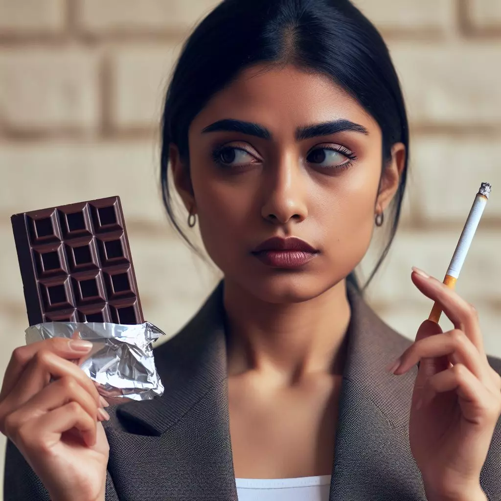 Mulher fica entre uma barra de chocolate amargo e um cigarro Imagem criada por inteligência artificial
