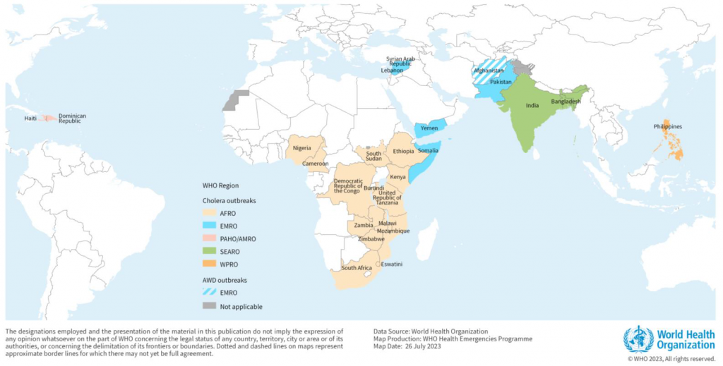 Epidemias globais de cólera e diarreia aquosa aguda relatadas em 2023, em 15 de dezembro de 2023