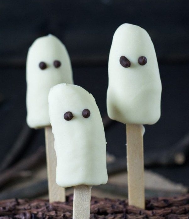 Corte uma das pontas das bananas, espete no palito e leve ao congelador por alguns minutos. Após esse processo, retire as bananas e mergulhe no iogurte natural até que toda a banana esteja coberta, leve novamente ao congelador e deixe por uma ou duas horas. Depois que o iogurte estiver bem durinho, derreta do chocolate meio amargo e com a ajuda de um palito faça os olhinhos do fantasma e coloque novamente no congelador para secar os olhinhos. A quantidade dos ingredientes vai depender de quantos palitos você desejar fazer. Receita recomendada para crianças a partir de um ano de idade.