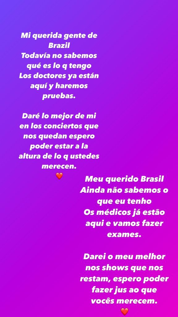 Quando se apresentou em São Paulo na última segunda-feira (13), afirmou nos stories do Instagram que, além de uma febre persistente, está lidando com intensa tosse, dores nas costas e rouquidão, o que compromete sua performance nos palcos brasileiros.