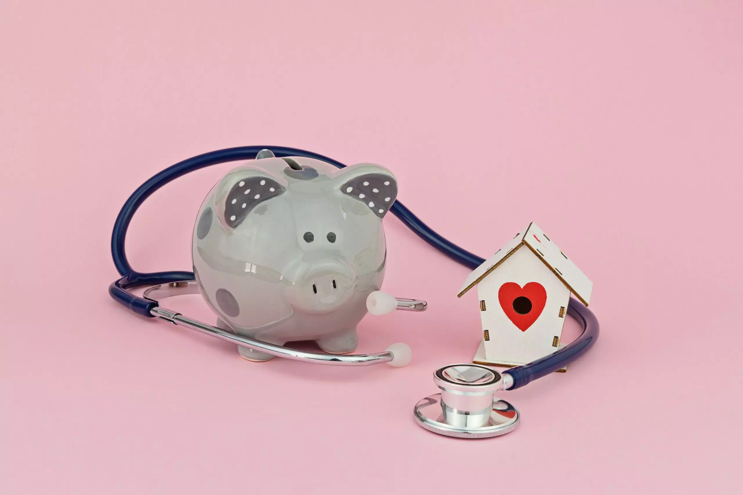 Mealheiro mealheiro, casa e estetoscópio em fundo rosa Por Kira_Yan