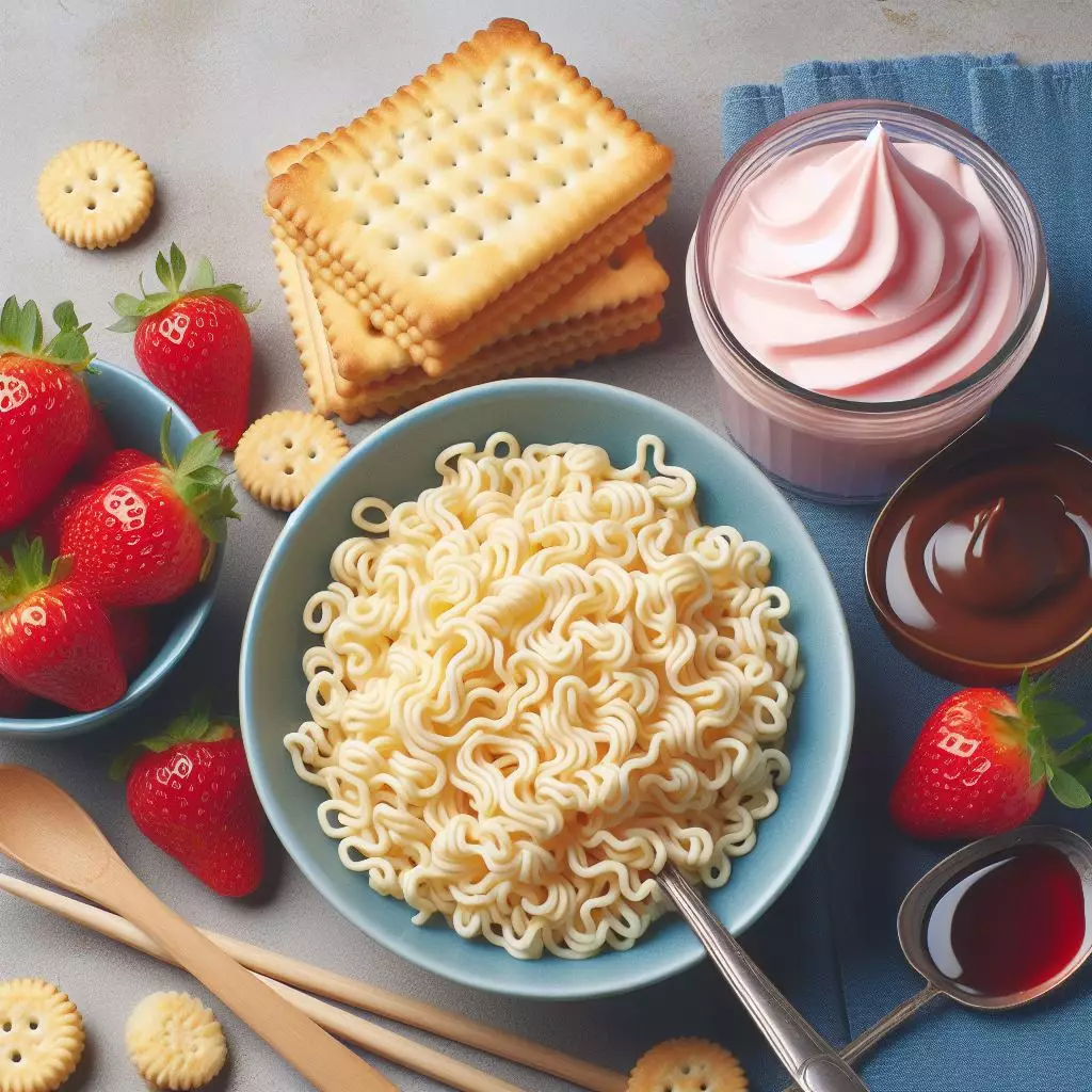 Imagem de macarrão instantâneo, biscoito maisena, sobremesa petit-suisse sabor morango Imagem criada por inteligência artificial