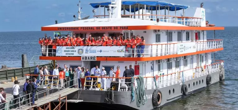 Na agenda desta segunda (7), o presidente Lula e a ministra Nísia Trindade visitam o Navio Hospital Escola Abaré, a primeira Unidade Básica de Saúde Fluvial do país. A embarcação, gerida pela Universidade Federal do Oeste do Pará (Ufopa) em parceria com o Ministério da Saúde e municípios do Pará, realiza atendimentos clínicos e odontológicos para comunidades ribeirinhas do rio Tapajós e terá um Ponto de Inclusão Digital (PID) para atendimentos de telessaúde.