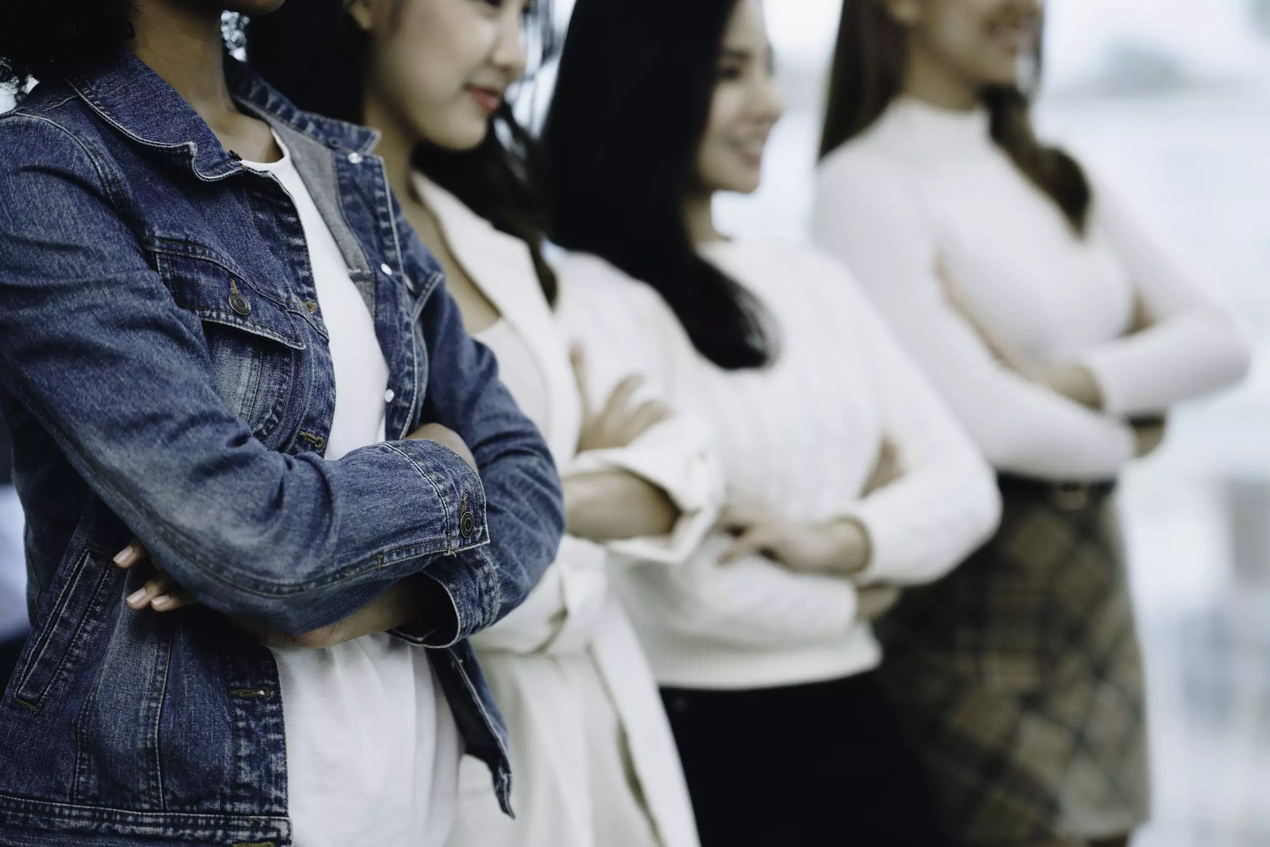 Many businesswomen stand in a row crossing their arms and ensuring company, organization, employees, unity and support. Concept of corporate partnership and human resource growth