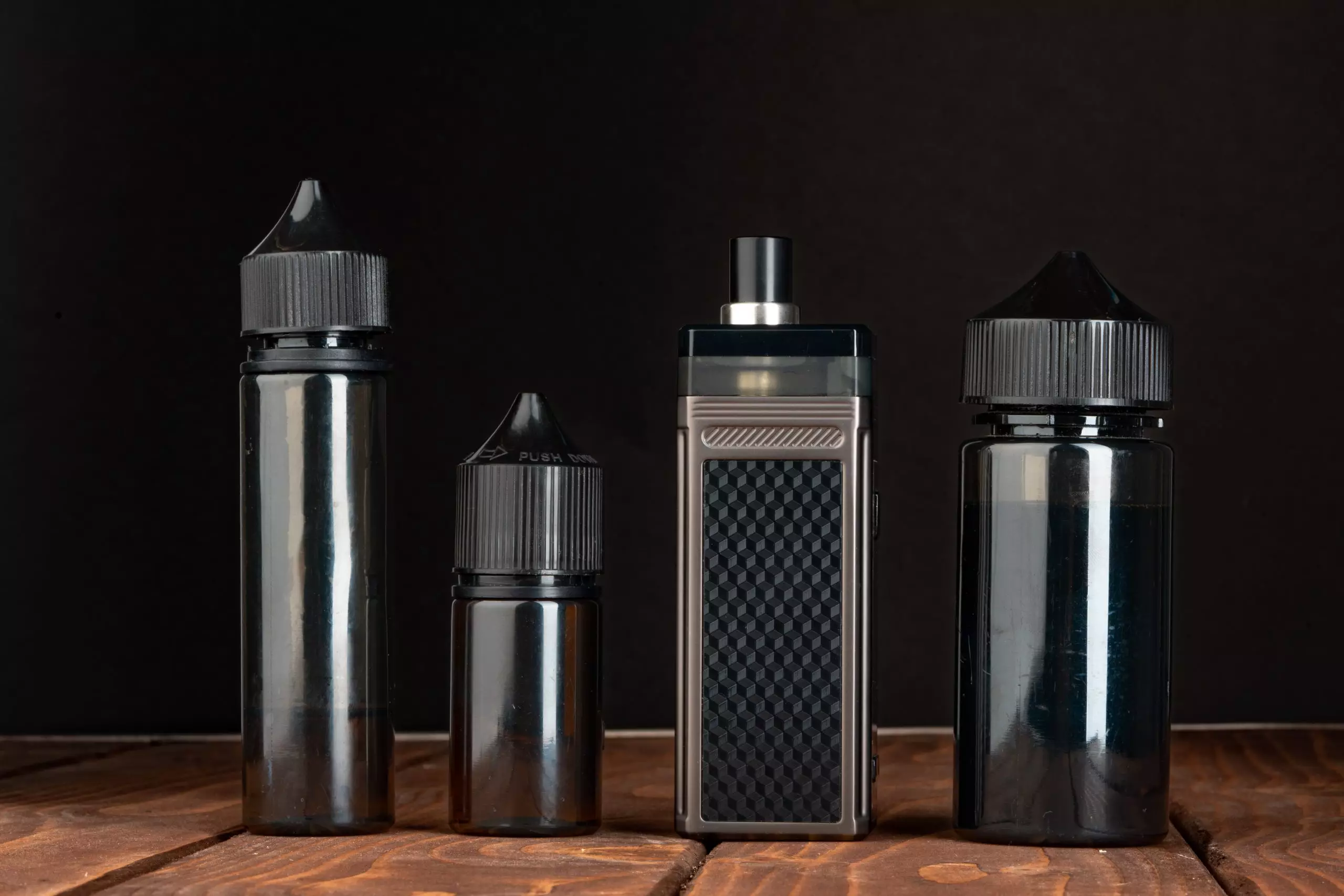 Vape e garrafas de líquido vape contra fundo preto Por FabrikaPhoto