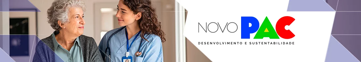Logo Oficial do NOVO PAC no Eixo Saúde, mostra uma profissional da saúde atendendo uma pessoa idosa