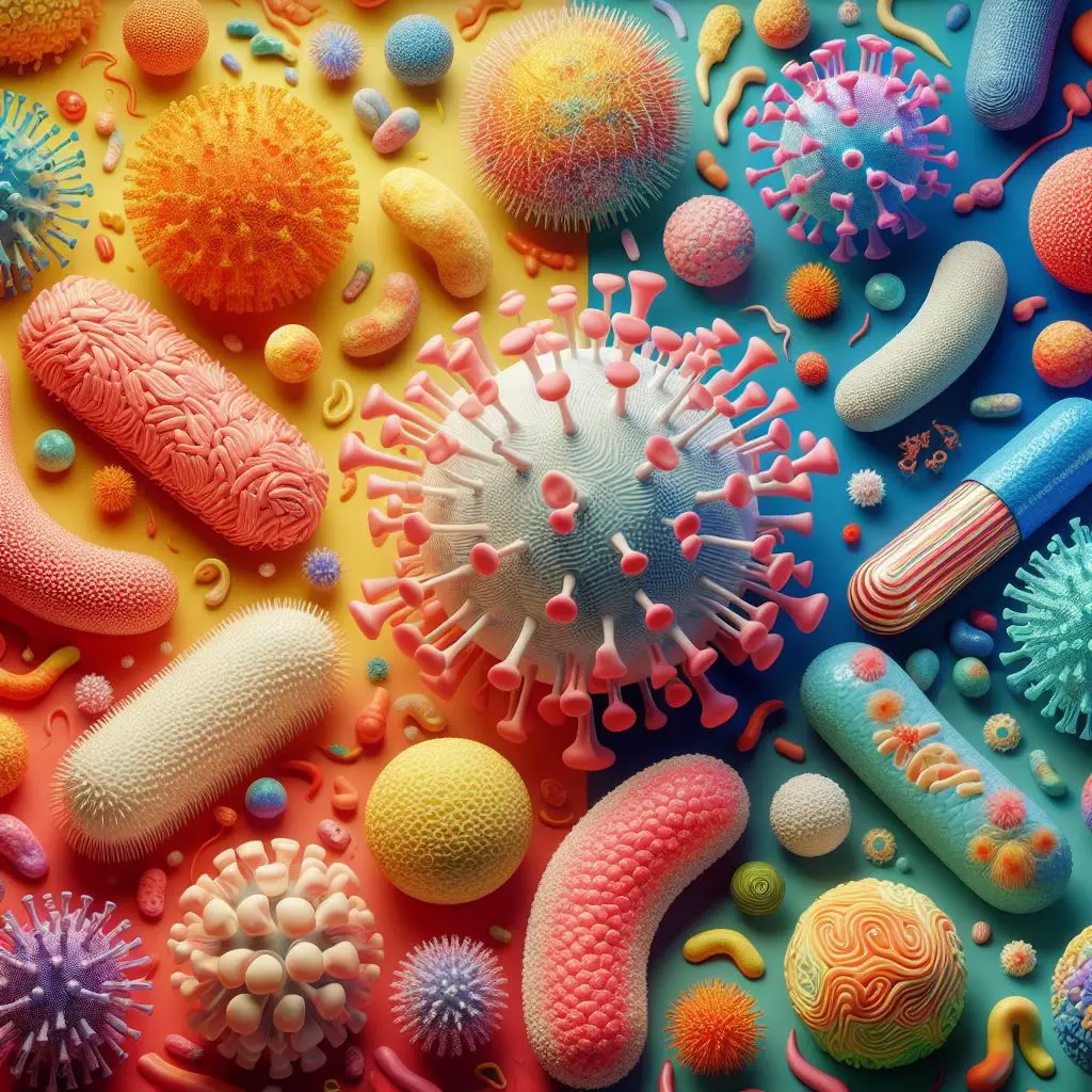 Exemplos de bactérias e vírus Imagem criada por inteligência artificial