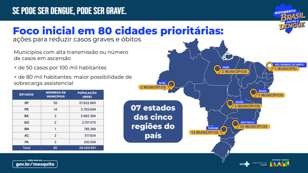 O Ministério da Saúde está intensificando o combate à dengue em 80 municípios em todo território nacional considerados prioritários.