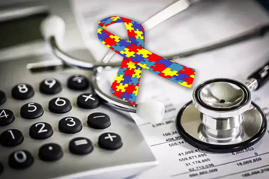 Símbolo do transtorno do espectro autista (TEA) com fundo de estetoscópio, calculadora e documentos, simbolizando planos de saúde
