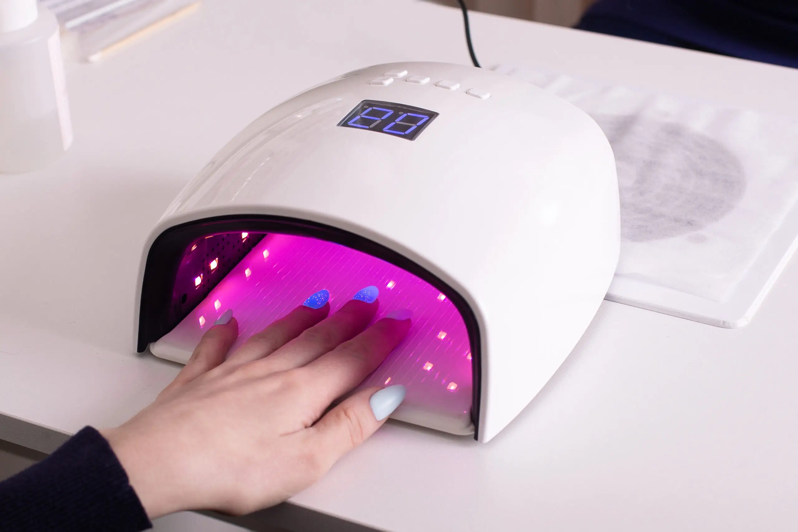 Elcilane Gomes alerta para os riscos que a cabine de luz ultravioleta pode trazer para a pele. “ Ela pode sim trazer riscos para a pele, para as unhas. Já existem alguns estudos nesse sentido em que demonstraram que a exposição à radiação ultravioleta dessas lâmpadas utilizadas para secar o gel, pode sim ser cancerígena. Alguns pesquisadores identificaram que esse risco é proporcional ao tempo de exposição, ou seja, o perigo de câncer aumenta com o uso prolongado, porém, a gente sabe que a cabine — apesar de emitir essa luz intensa, tem a exposição bem baixa em comparação com a exibição solar. Além disso, não é feito de uma forma tão recorrente. Mas o risco de câncer de pele e de unha, apesar de ser baixo, existe.”
