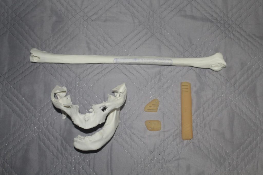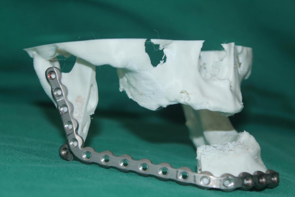 Com as imagens, foi gerado um protótipo tridimensional que possibilitou simular a cirurgia e criar guias cirúrgicos de corte. Esses dispositivos garantiram precisão na reconstrução da face e da mandíbula.