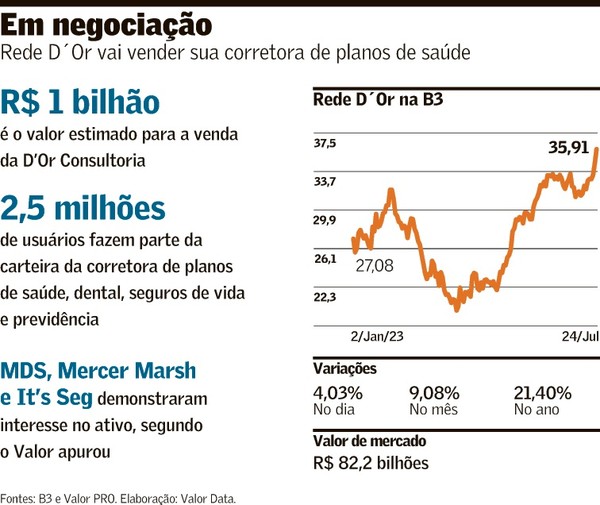 A Rede D’Or está em negociações avançadas para a venda de sua corretora de planos de saúde, dental, seguros de vida e previdência. Entre os interessados estão as concorrentes MDS, Mercer Marsh e It’sSeg. A transação é avaliada em cerca de R$ 1 bilhão, segundo o Valor apurou.