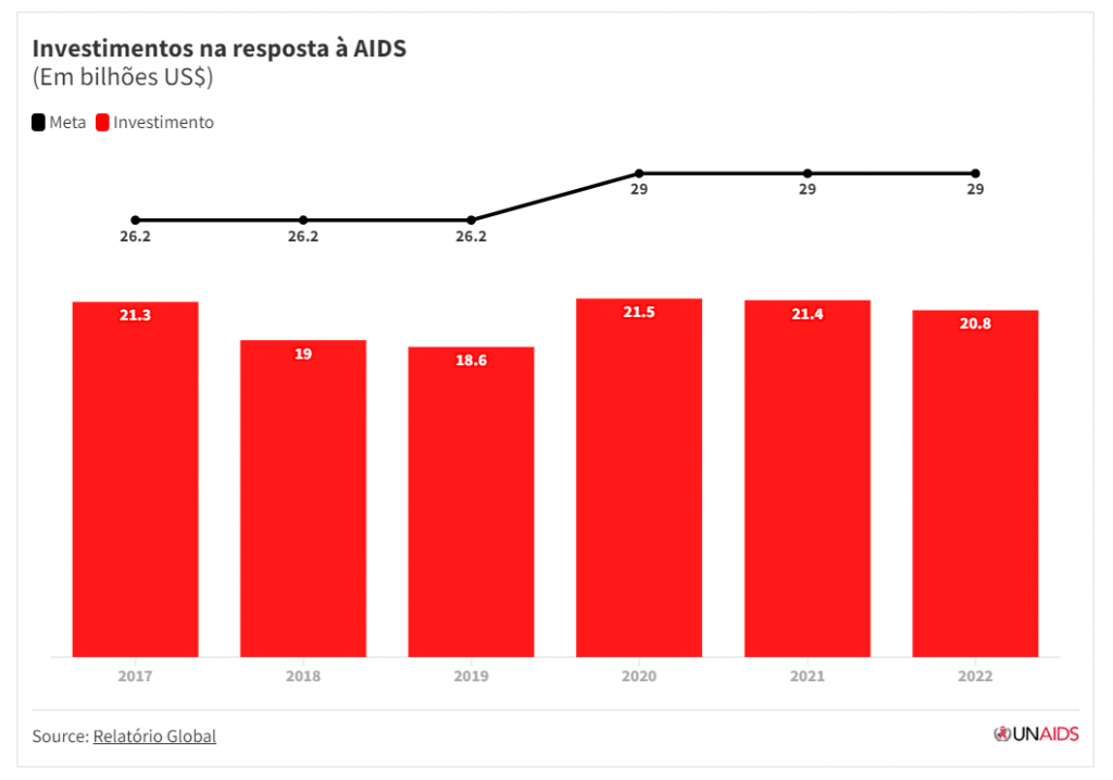 O financiamento para o HIV também diminuiu em 2022, tanto de fontes internacionais quanto domésticas, retornando ao mesmo nível de 2013. O financiamento totalizou US$ 20,8 bilhões em 2022, muito aquém dos US$ 29,3 bilhões necessários até 2025.