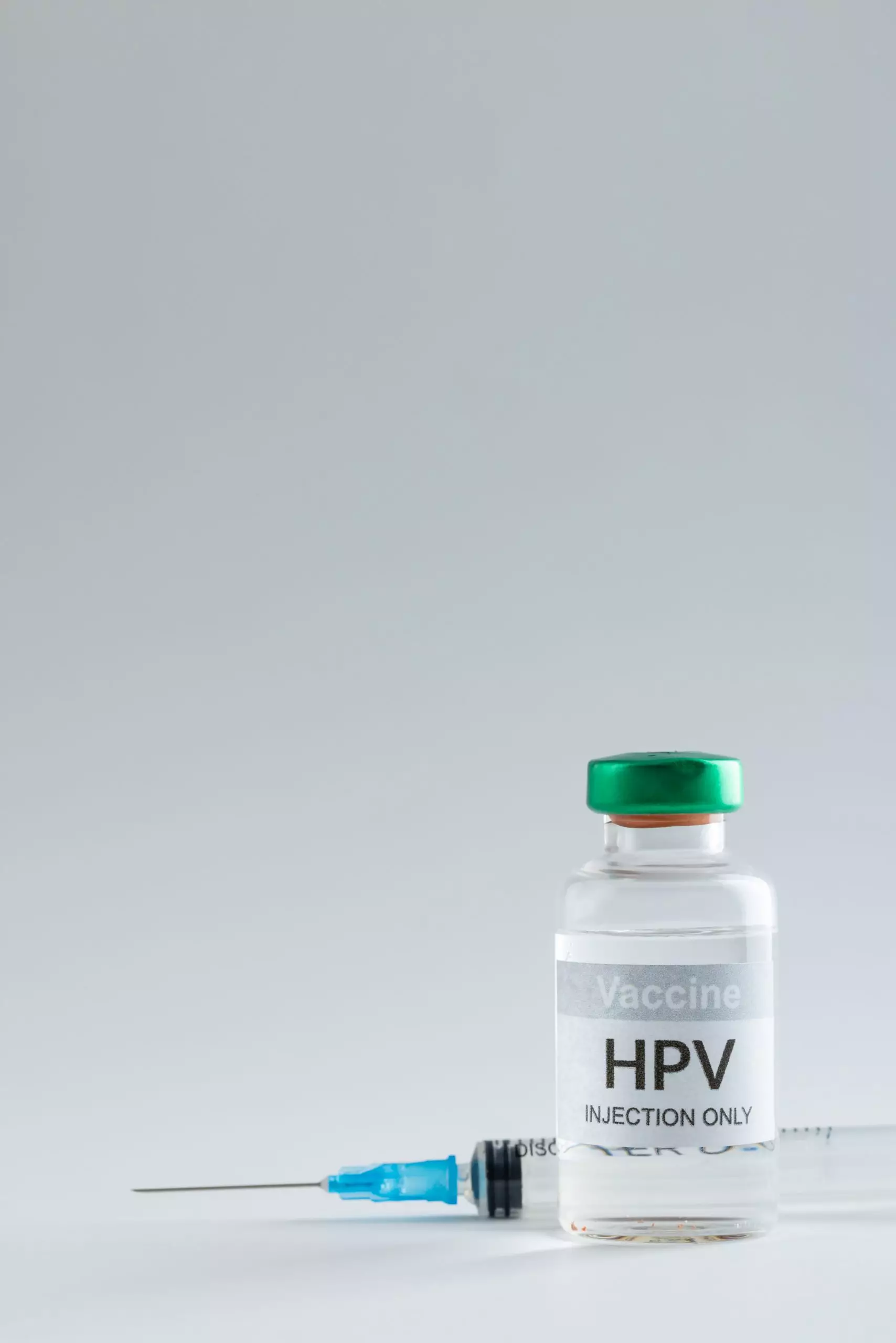 Composição vertical do frasco e seringa da vacina contra o HPV em fundo cinza com espaço de cópia Por Wavebreakmedia