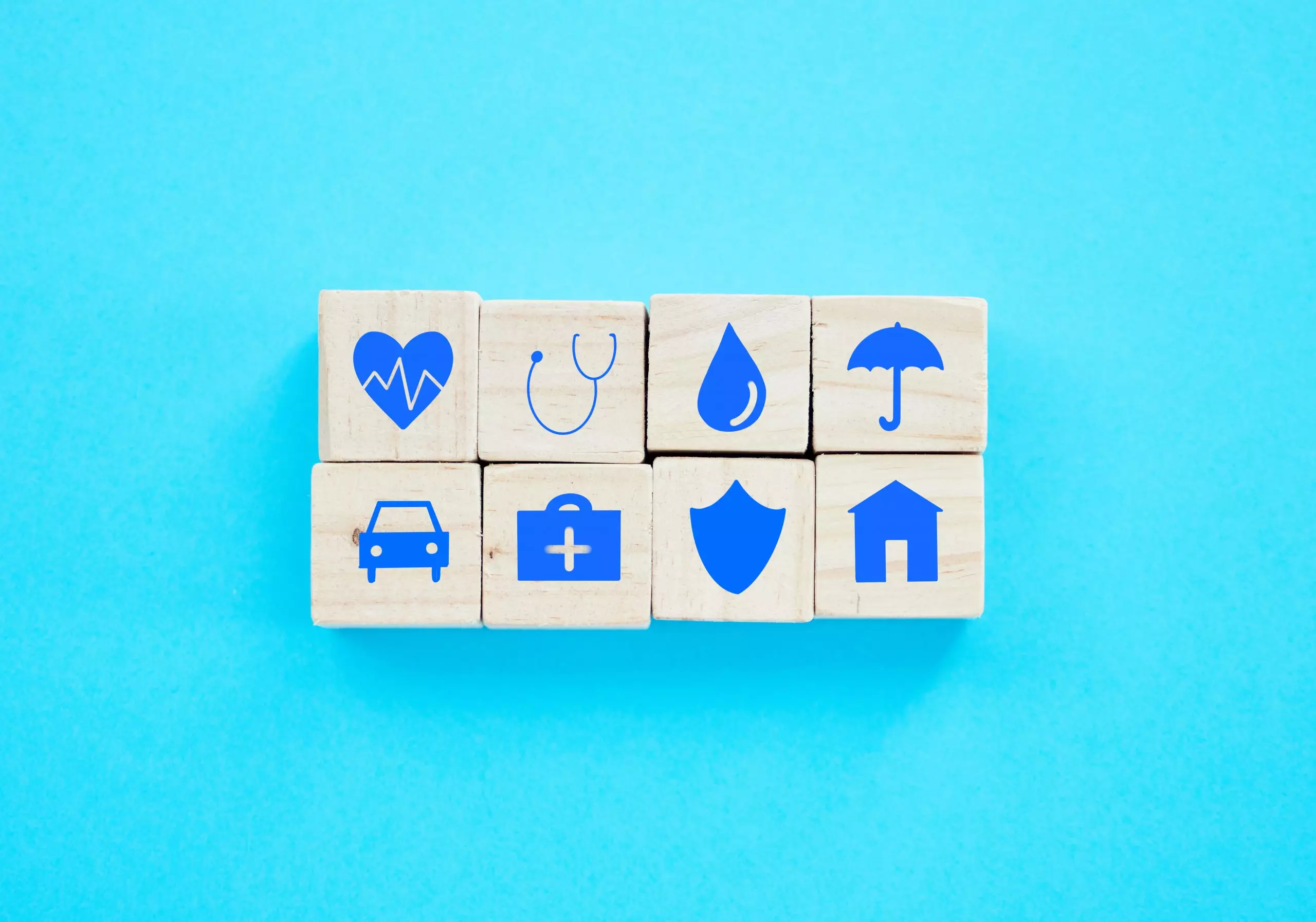 Foto de blocos de madeira com símbolos relacionados a seguros sobre um fundo azul Por YuriArcursPeopleimages
