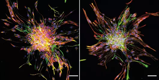 Para simular esse processo, os pesquisadores usaram placas de cultura contendo substâncias que estimulam o processo de diferenciação. Nesse experimento, em lugar de permanecer como neuroesferas, as células progenitoras aderem ao fundo da placa e migram, espalhando-se pela superfície.